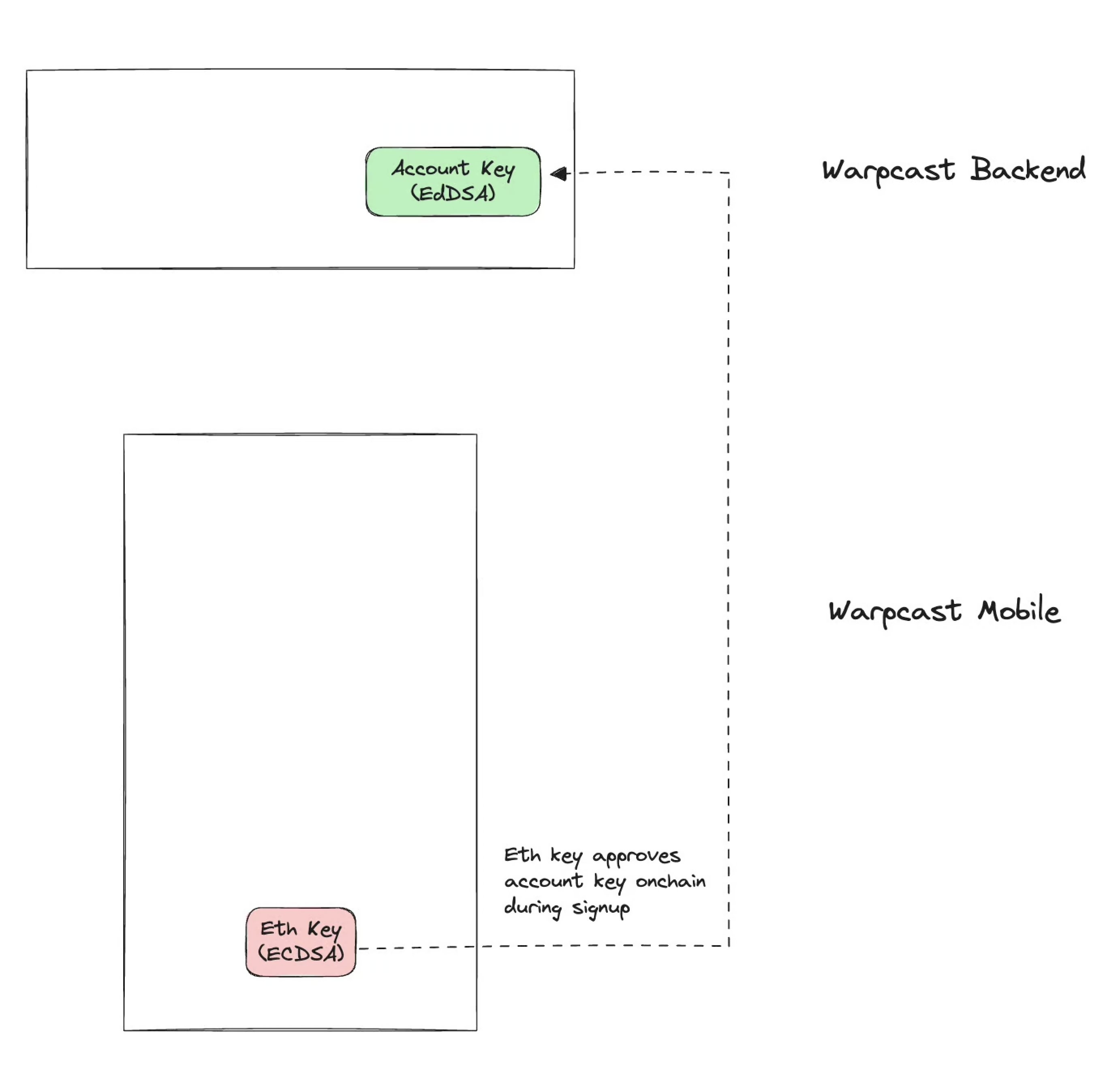The possibility of Frames is due to Warpcast's account structure, with the crucial Ethkey stored on the phone, controlling the entire account and generated Ethereum address. However, frequent use of the Ethkey is risky due to its importance. Thus, Warpcast's backend uses an account key (Signer) for actions within Frames, sending messages, and reactions.