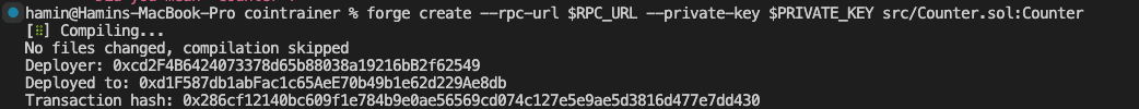 forge create --rpc-url $RPC_URL --private-key $PRIVATE_KEY src/Counter.sol:Counter
