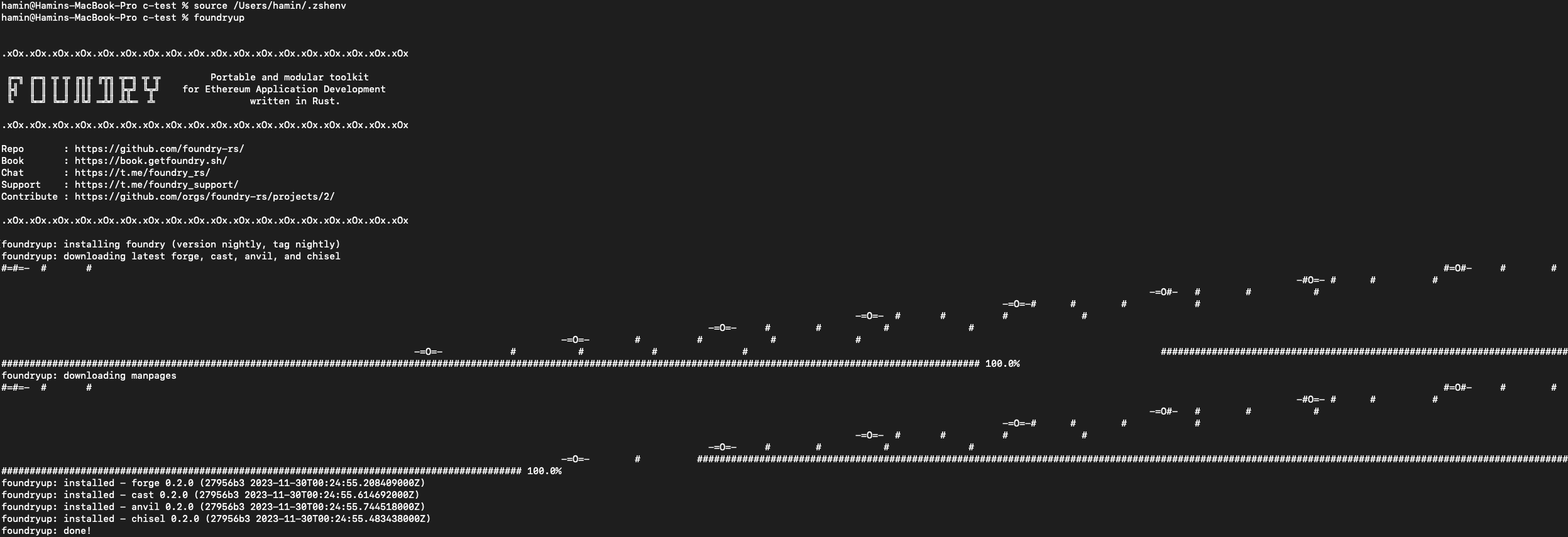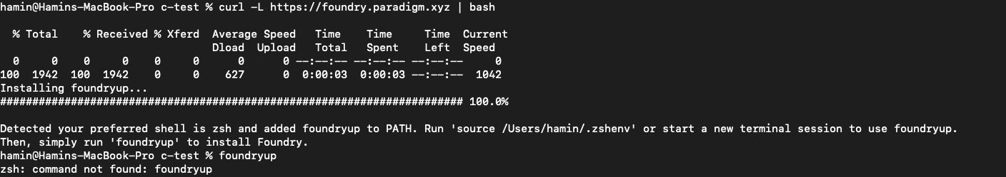 `source /Users/hamin/.zshenv`(나의 경우) 이런 식으로 돌린 후 foundryup를 실행할 수 있다.